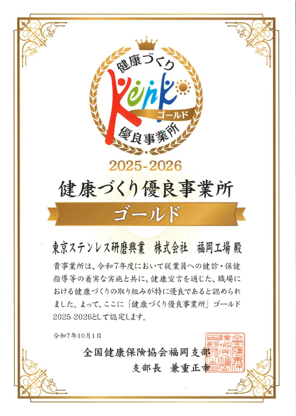 当社は「安全と健康は全てに優先する」をモットーの1つに掲げて事業活動を行っていますが、この度、日頃の活動が評価され、福岡工場が全国健康保険協会(福岡支部)より「健康づくり優良事業所ゴールド」の認定を取得しました。